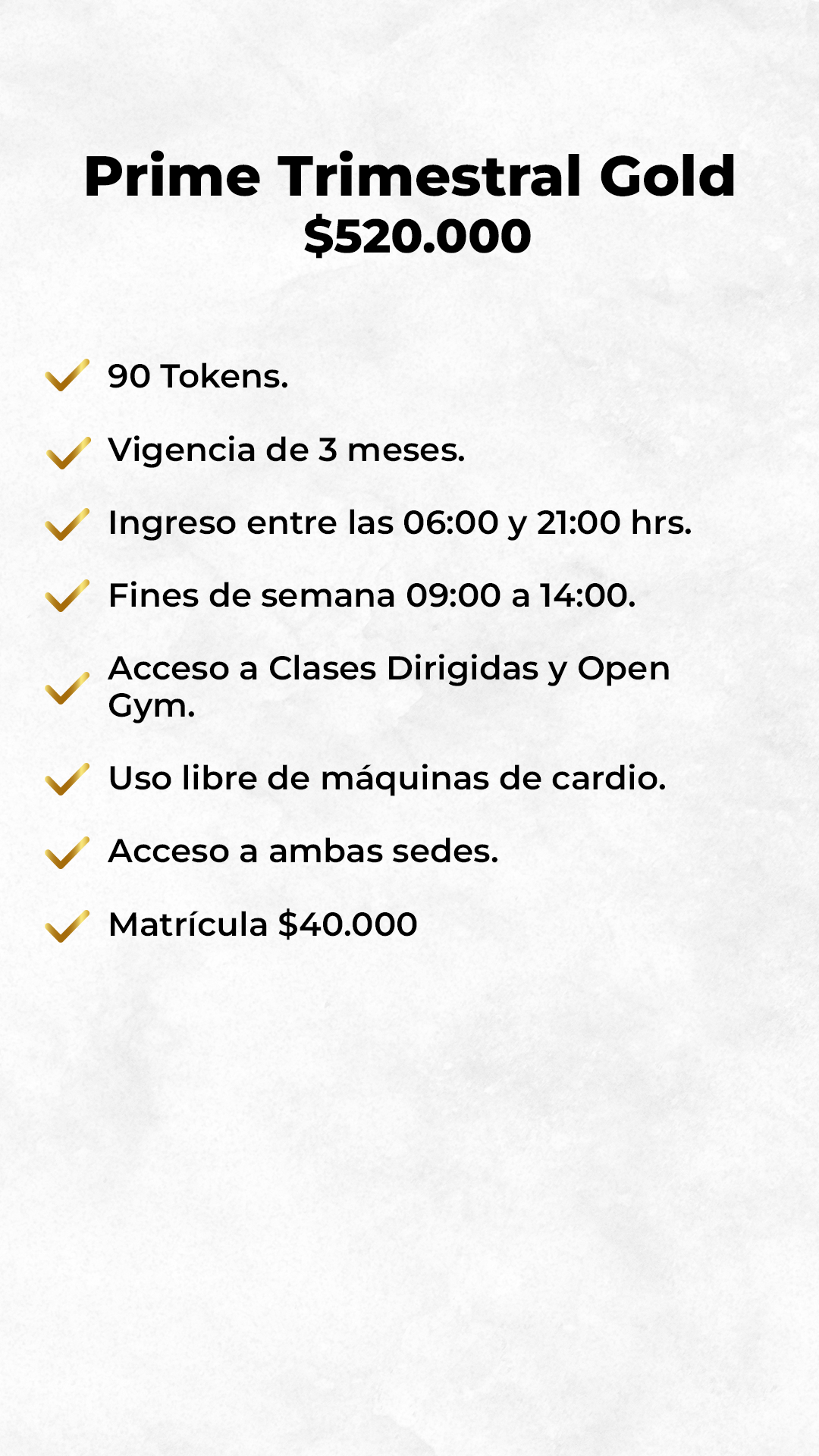 - Acceso a Open Gym y Clases Dirigidas en todo horario.