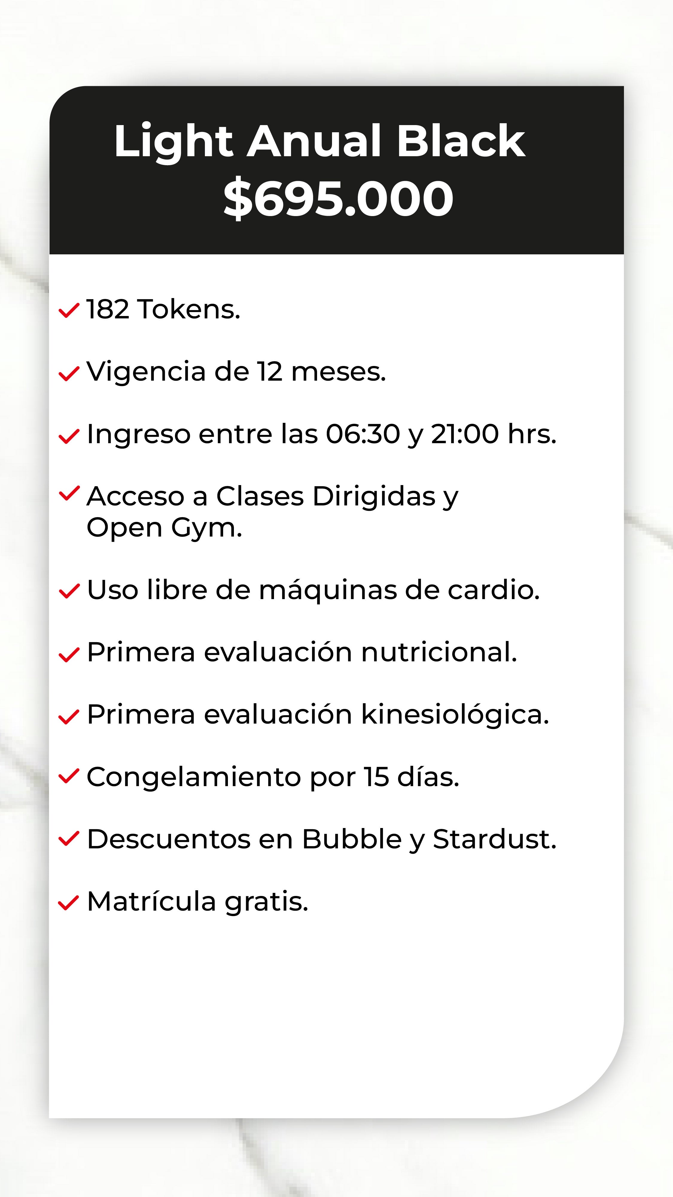 - Acceso a Open Gym y Clases Dirigidas en todo horario.