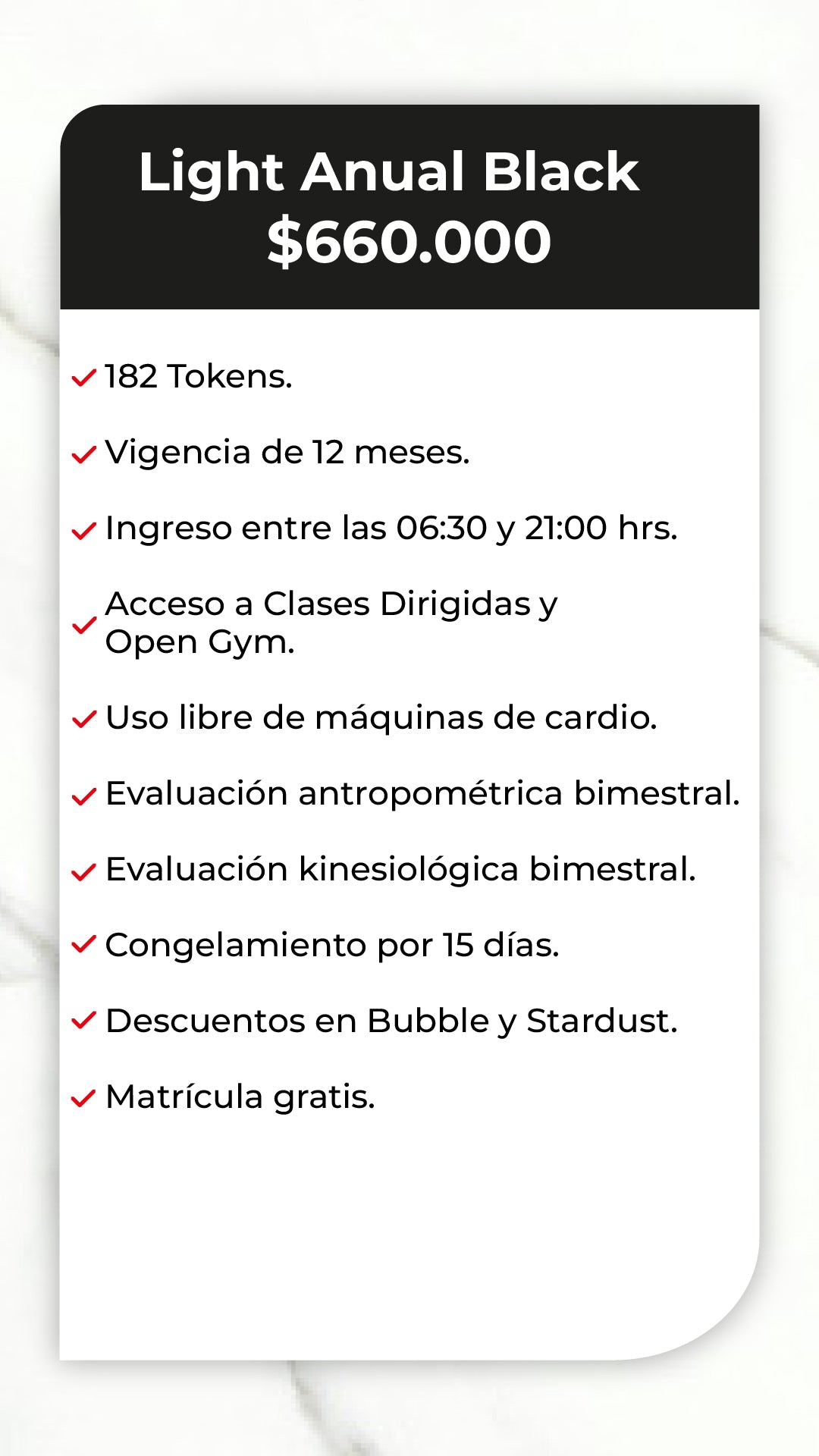 - Acceso a Open Gym y Clases Dirigidas en todo horario.